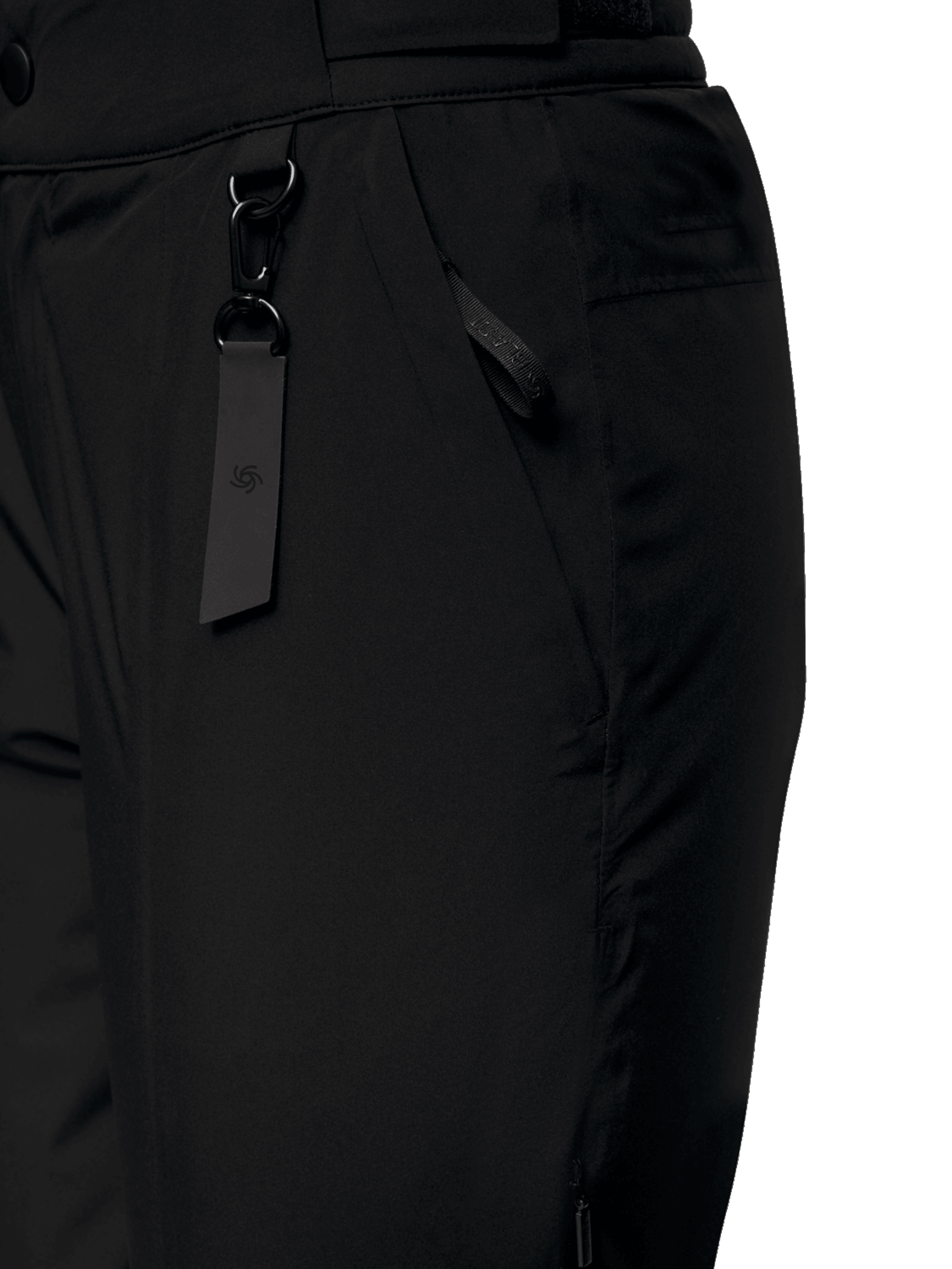 - Hidden snow gaiters at leg opening with hook-and-loop closure and snap button.