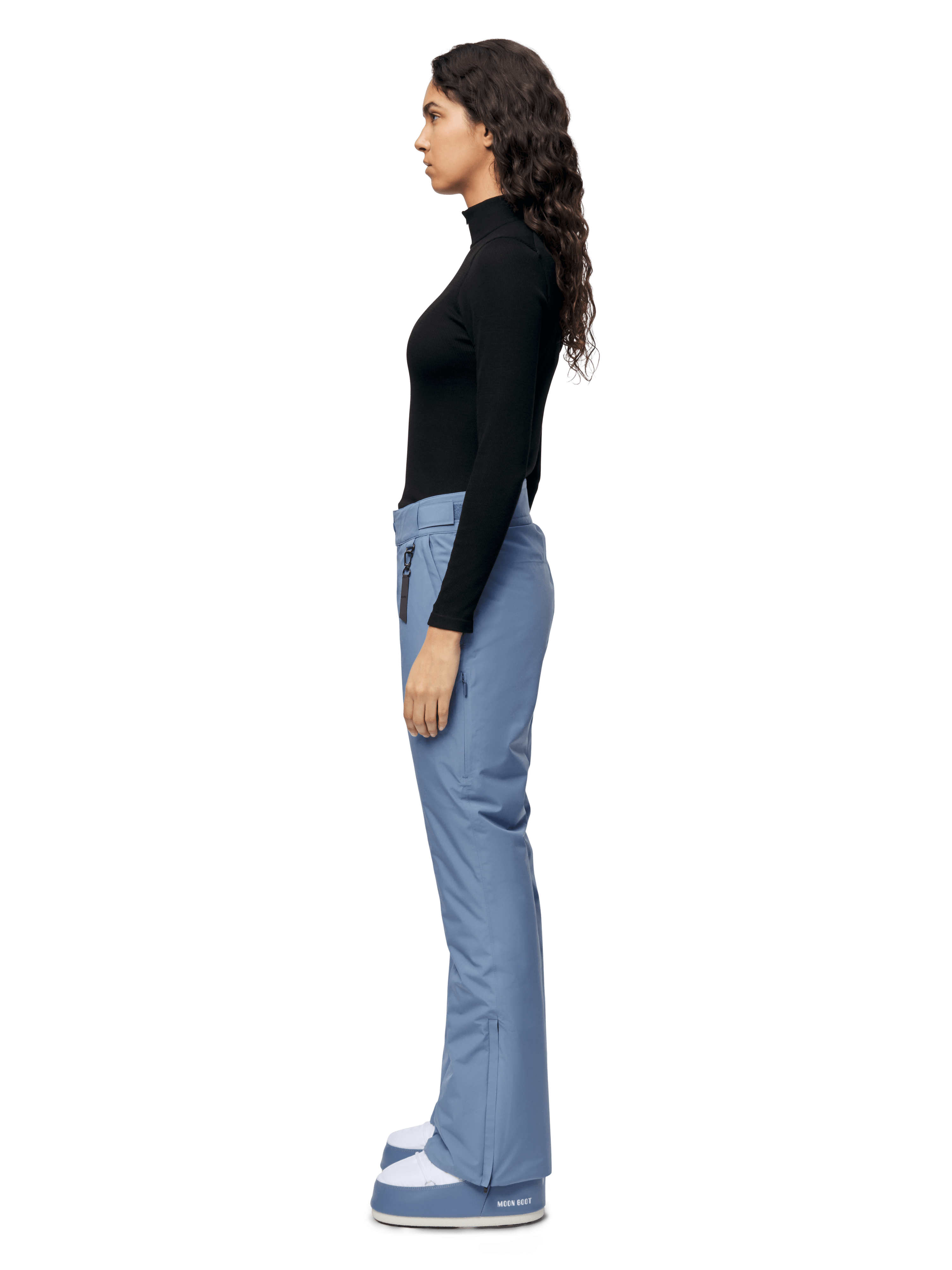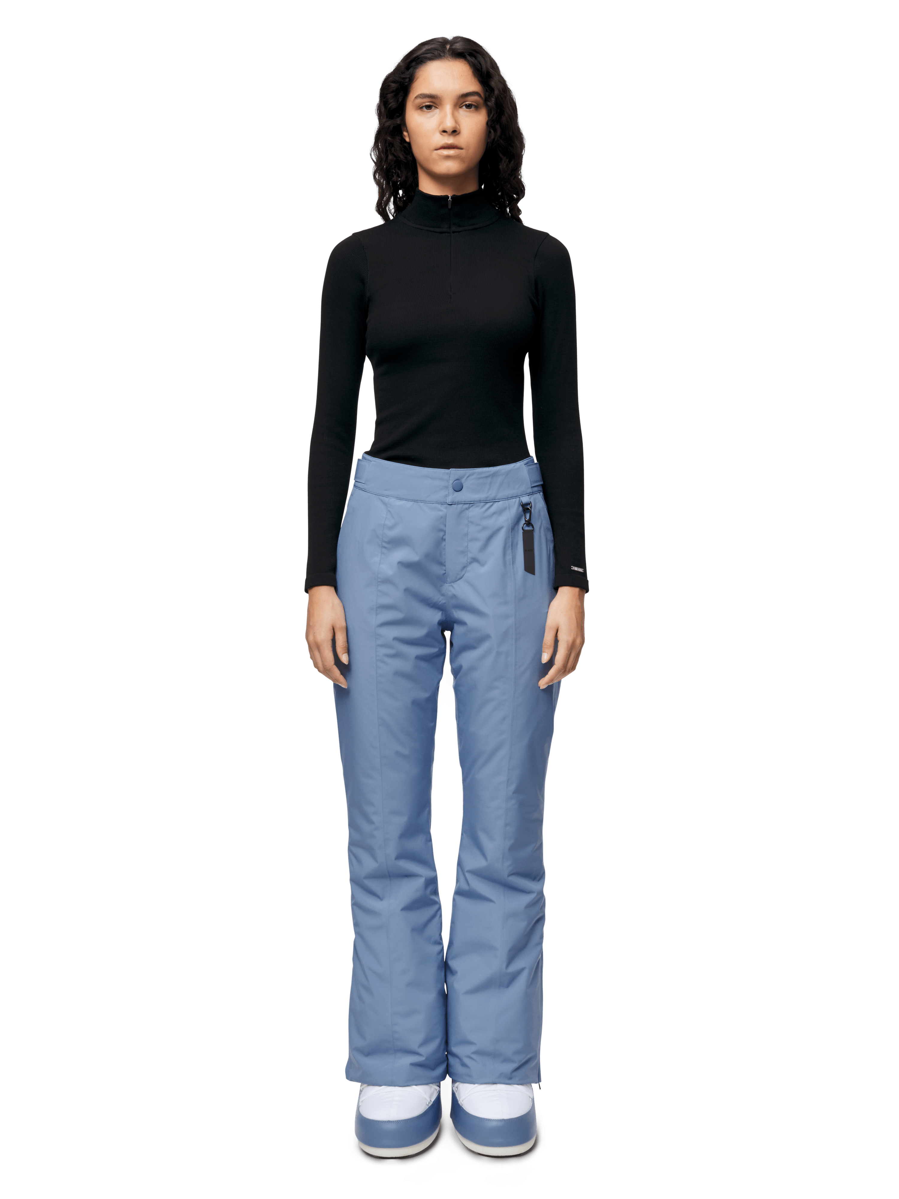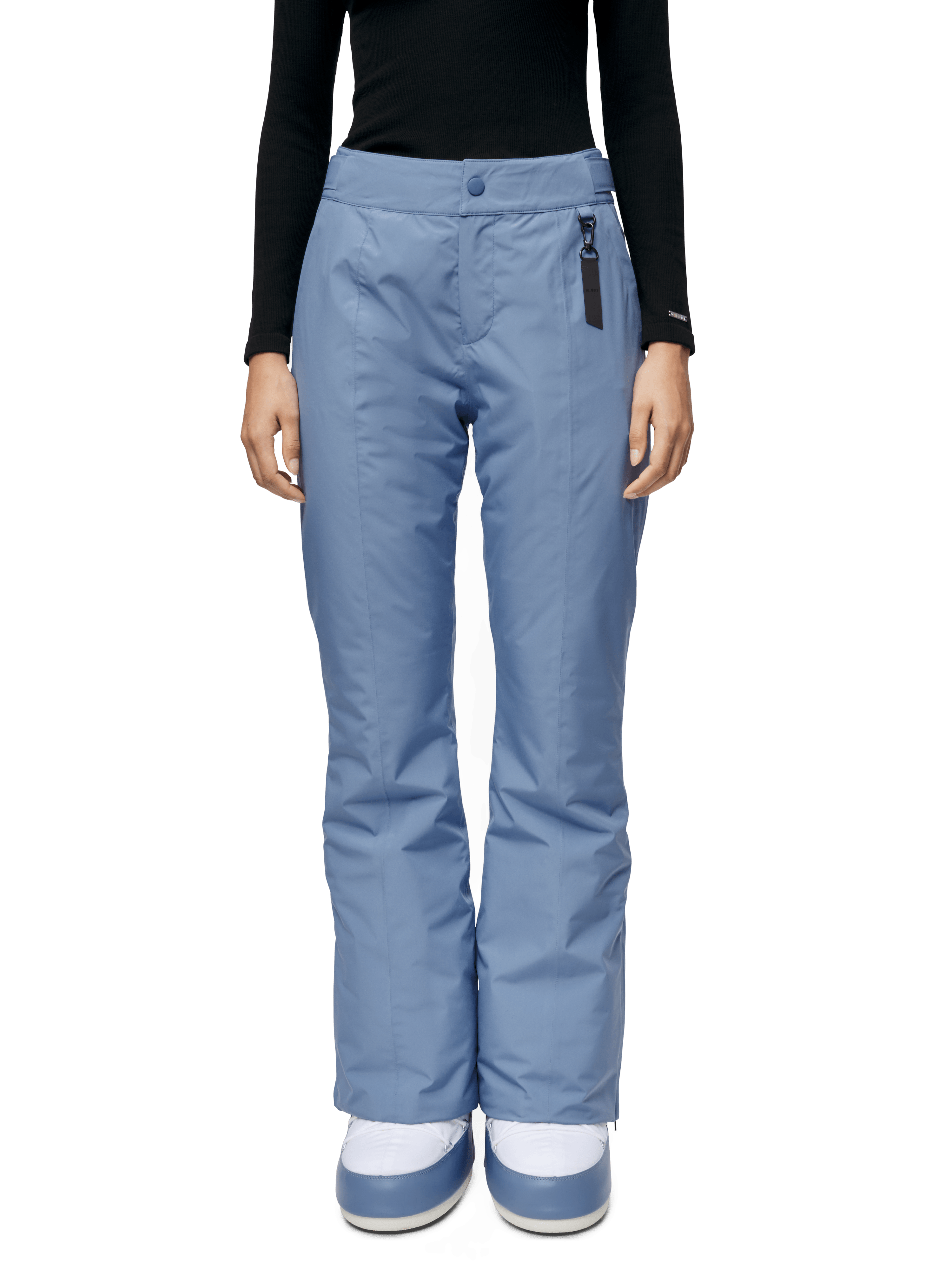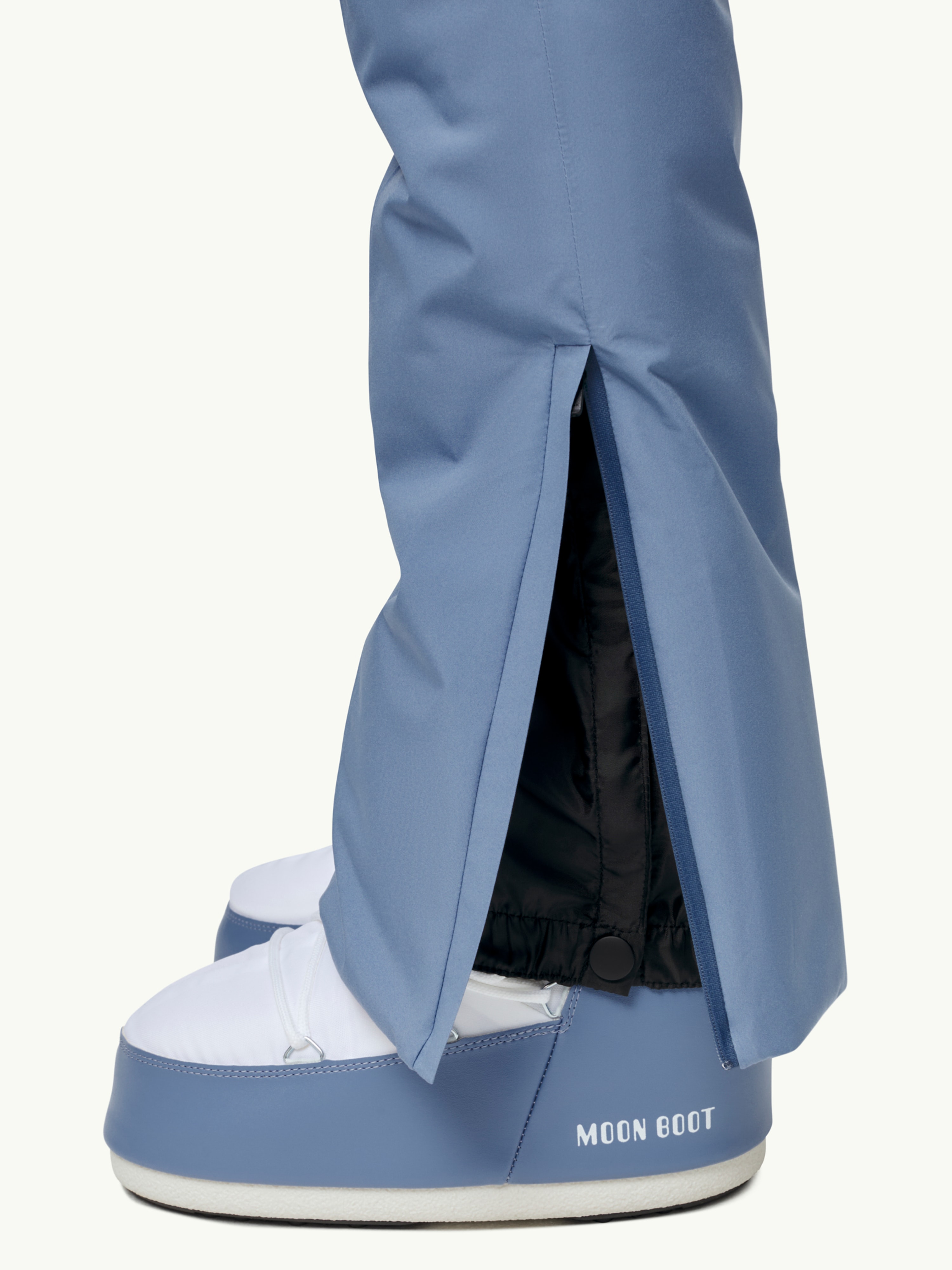 - Hidden snow gaiters at leg opening with hook-and-loop closure and snap button.