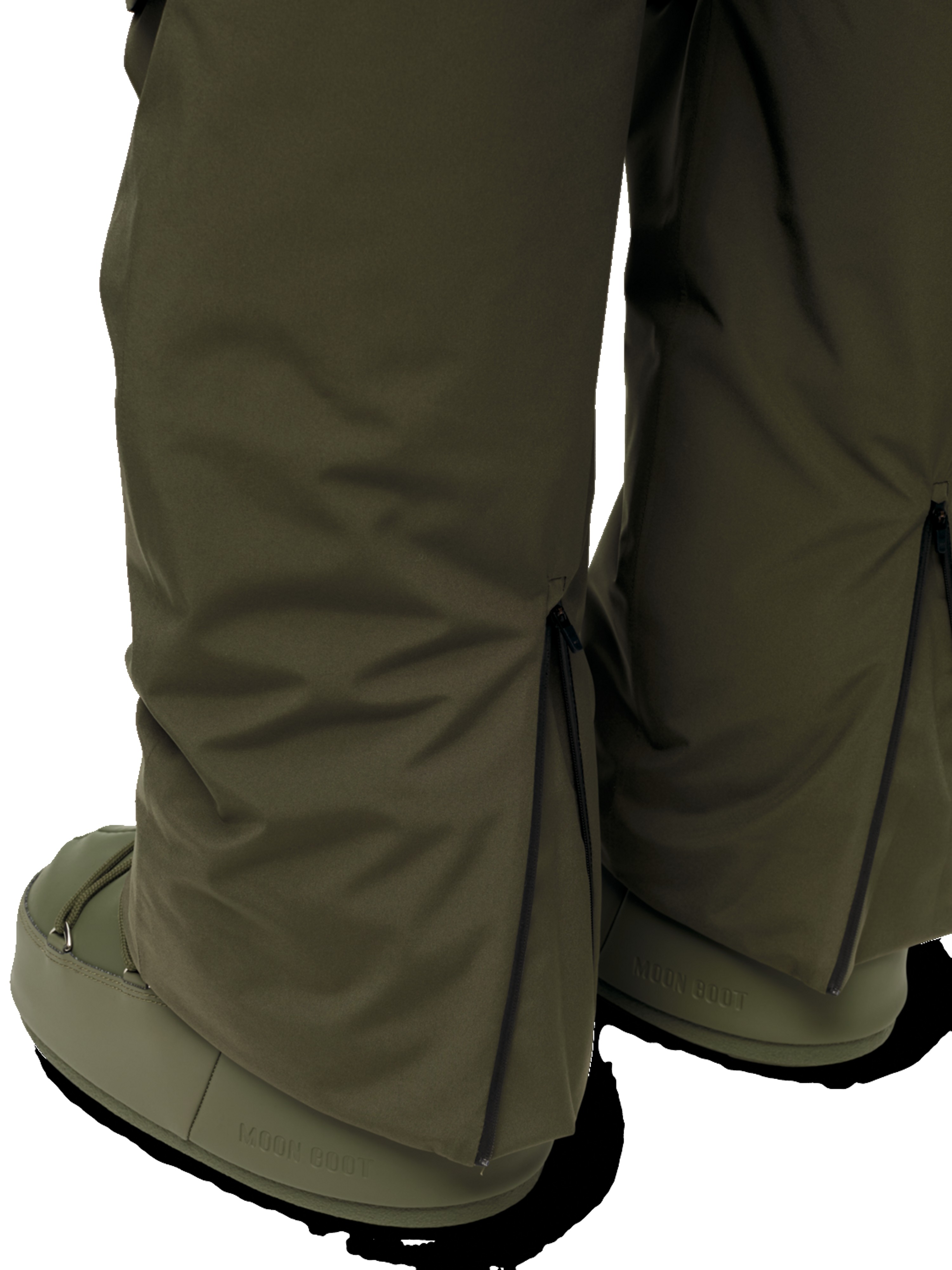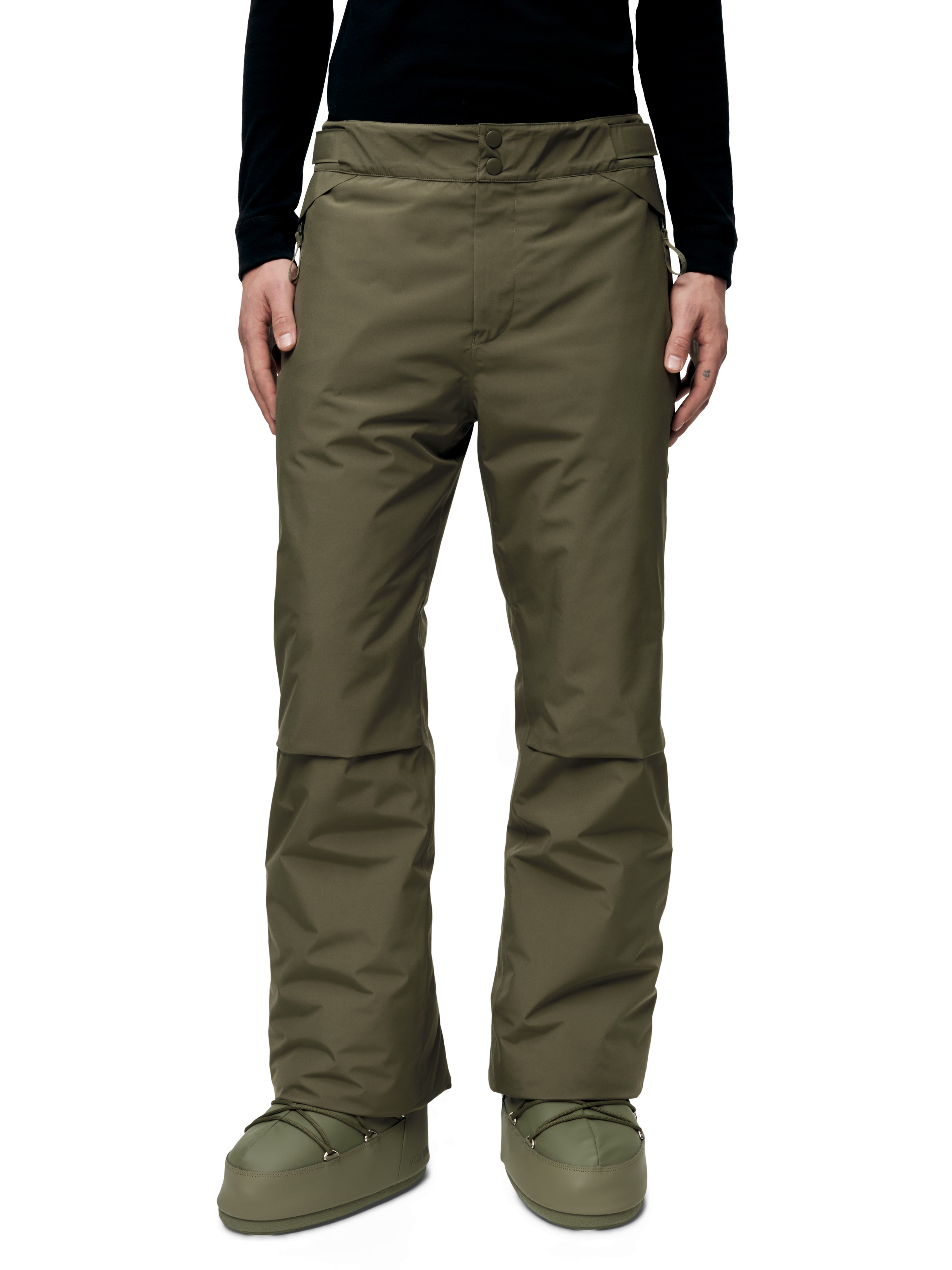 Snow gaiters at leg opening with hook-and-loop and snap button closure.