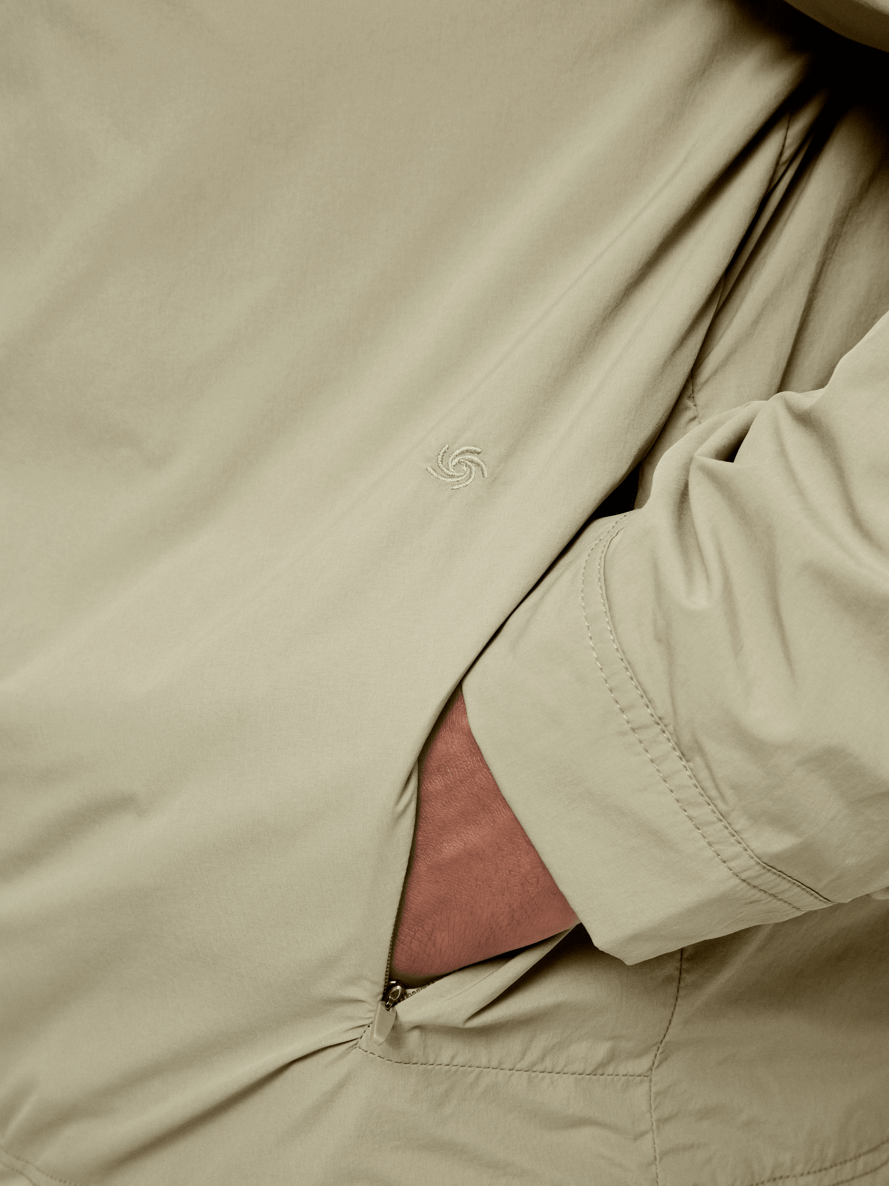 Clean cut panel with hidden zipper pockets at the sides.